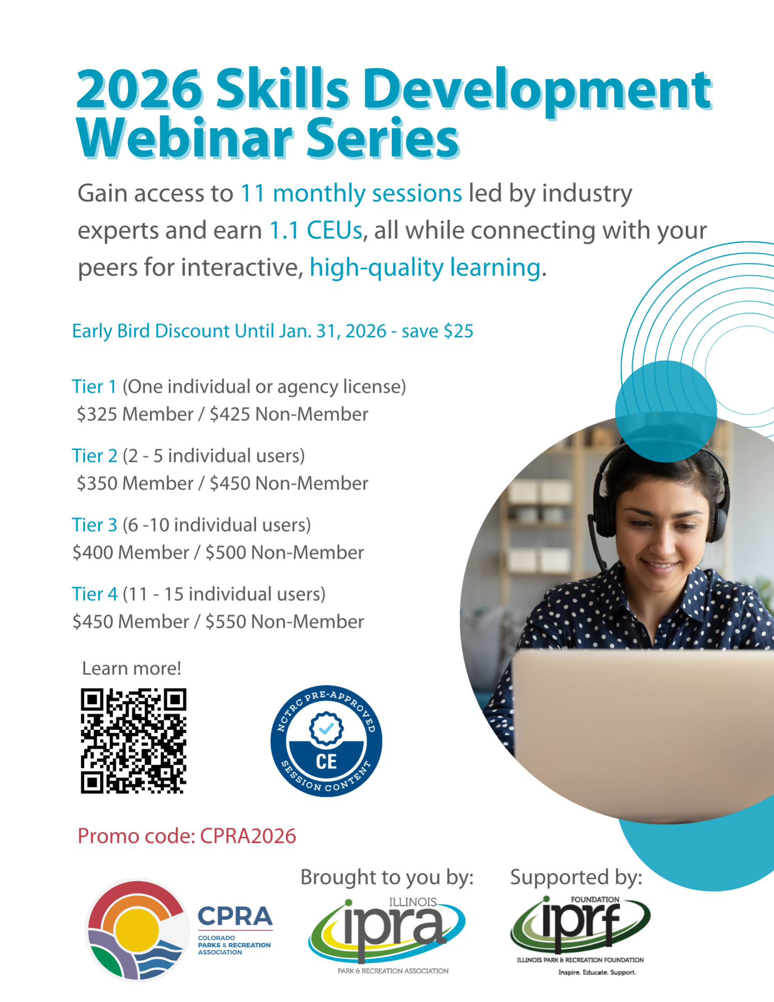 CPRA has partnered with Illinois Park & Recreation Association (IPRA) on their 2026 Skills Development Webinar Series! CPRA members can receive the IPRA member rate when registering for this series.